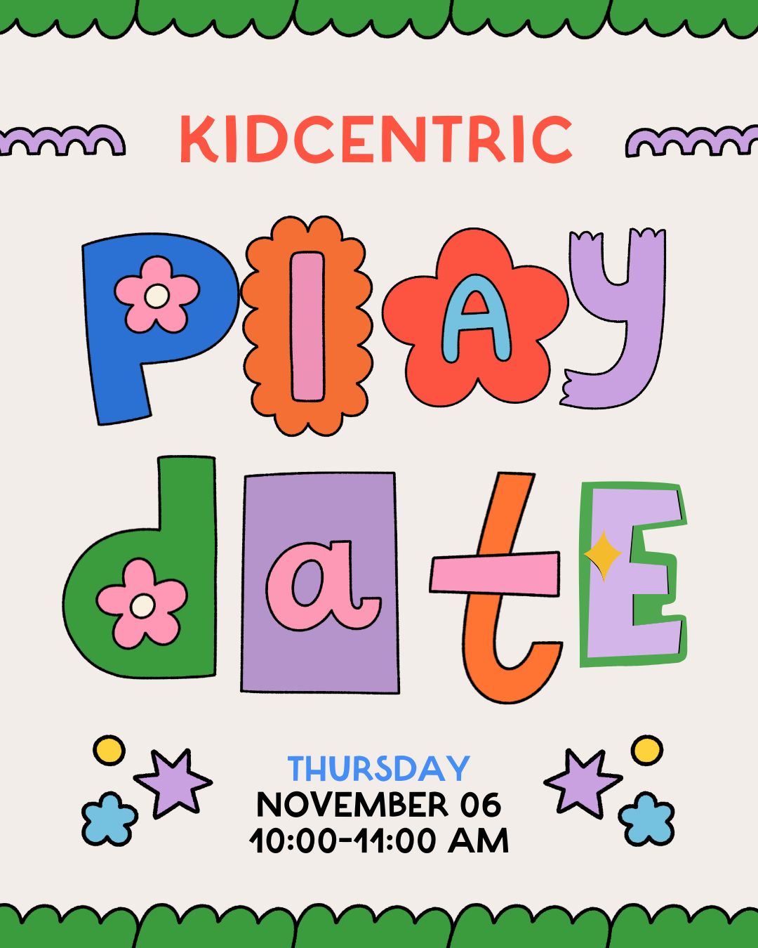 Join us for a relaxed morning at the brand-new Kidcentric Creative Studio, where imagination leads the way! From craft tables to trinket shelves, sensory play stations, and a cozy calm area for the littlest ones — there’s something for every child to enjoy. Due AT Playdate: $15 for ages 4+, $10 for ages 3 and under, (Add-on projects available for purchase).